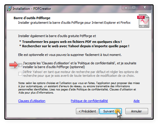 عملية تنصيب البرنامج سهلة -في متناول المبتدئين في مجال الحاسب- ولا تحتاج لشرج؛ إلا أنه يجب الانتباه لإحدى مراحلها، أين سيُعرض عليك تنصيب شريط أدوات Pdfforge واختيار Yahoo كمحرك بحث افتراضي، ألغ هذه الخيارات -ننصح بذلك- كما هو موضح في الصورة التاية: