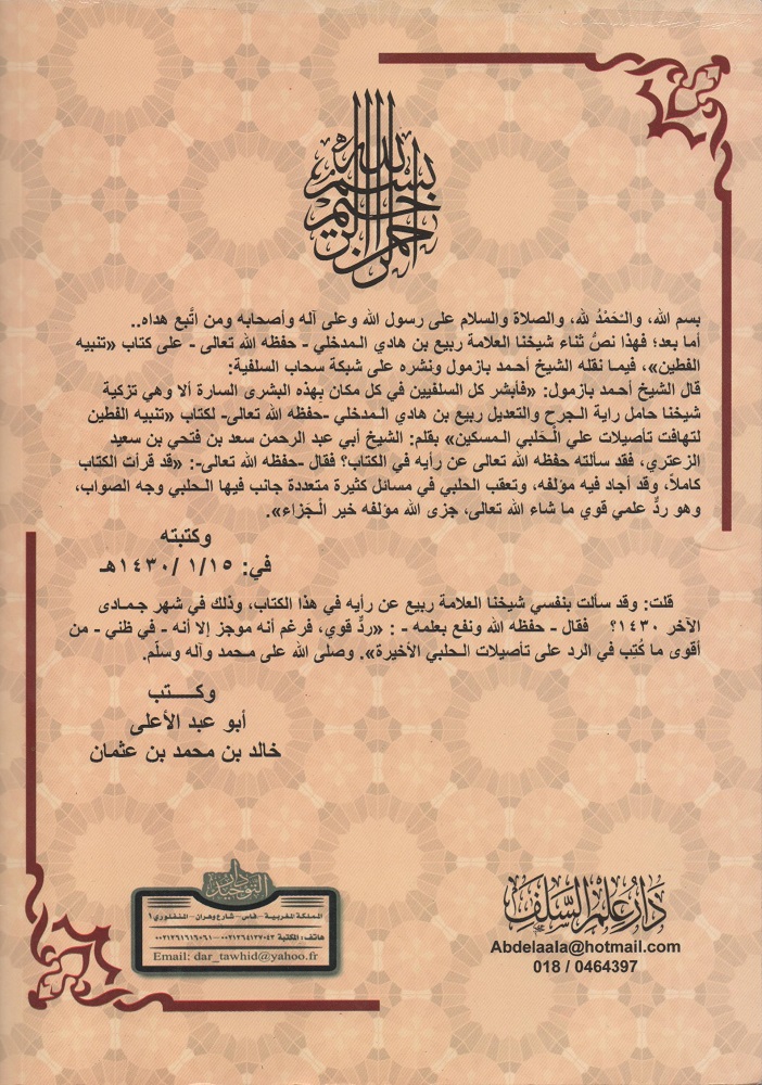 "قلتُ: وقد سألتُ بنفسِي شيخَنا العلَّامة رَبِيع عنْ رأيِه في هذا الكتابِ، وذلك في شهرِ جُمادَى الآخر 1430 هـ، فقالَ: ((ردٌّ قويٌّ، فرغمَ أنَّه موجزٌ إلَّا أنَّه -في ظنِّي- من أقوَى مَا كُتِبَ في الرَّدِّ على تأصيلاتِ الحلبيِّ الأخيرةَ.))..."