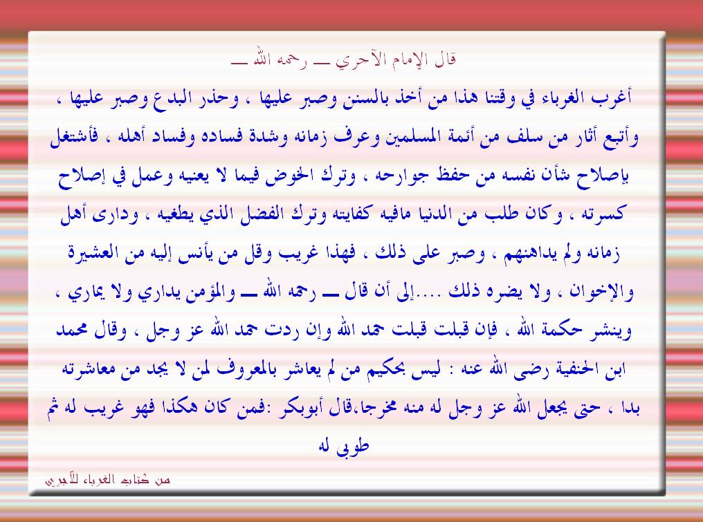 (...أغرب الغرباء في وقتنا هذا من أخذ بالسنن وصبر عليها ، وحذر البدع وصبر عليها ، وأتبع أثار من سلف من أئمة المسلمين وعرف زمانه وشدة فساده وفساد أهله ، فأشتغل بإصلاح شأن نفسه من حفظ جوارحه ، وترك الخوض فيما لا يعنيه وعمل في إصلاح كسرته ، وكان طلب من الدنيا مافيه كفايته وترك الفضل الذي يطغيه ، ودارى أهل زمانه ولم يداهنهم ، وصبر على ذلك ، فهذا غريب وقل من يأنس إليه من العشيرة والإخوان ، ولا يضره ذلك ....إلى أن قال ـ رحمه الله ـ والمؤمن يداري ولا يماري ، وينشر حكمة الله ، فإن قبلت قبلت حمد الله وإن ردت حمد الله عز وجل ، وقال محمد ابن الحنفية رضى الله عنه : ليس بحكيم من لم يعاشر بالمعروف لمن لا يجد من معاشرته بدا ، حتى يجعل الله عز وجل له منه مخرجا،قال أبوبكر :فمن كان هكذا فهو غريب له ثم طوبى له. )