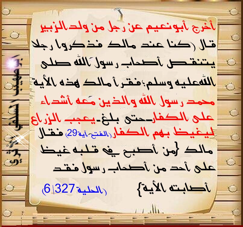 وأخرج أبونعيم عن رجل من ولدالزبير قال (كنا عند مالك فذكروا رجلا يتنقص أصحاب رسول الله صلى الله عليه وسلم؛فقرأ مالك هذه الأية(محمد رسول الله والذين معه أشداء على الكفارحتى بلغ- يعجب الزراع ليغيظ بهم الكفار)(الفتح آية29)فقال مالك {من أصبح في قلبه غيظ على أحد من أصحاب رسول الله فقد أصابته الآية}(الحلية6/327)ملف مرفق 1771