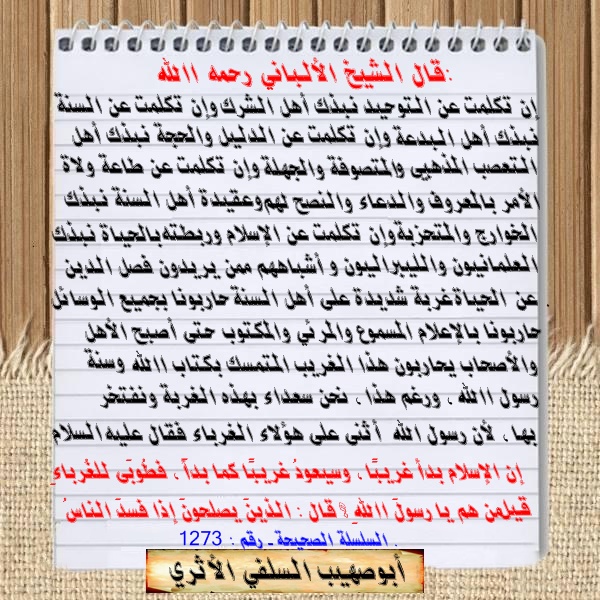 تنبيه أود أنبه إخواني إلى إن هذا الكلام ليس من كلام الألباني فلقد أخبرني أحد الإخوة من طلاب العلم أنه بحث عن سند هذا الكلام في السلسلة الصحيحة فلم يجدها إلا الحديث فقط فهو في السلسلة الصحيحة وقد تبين أن هذا الكلام من كلام أحد الحزبيين فعذرا على نشري لهذا الكلام
