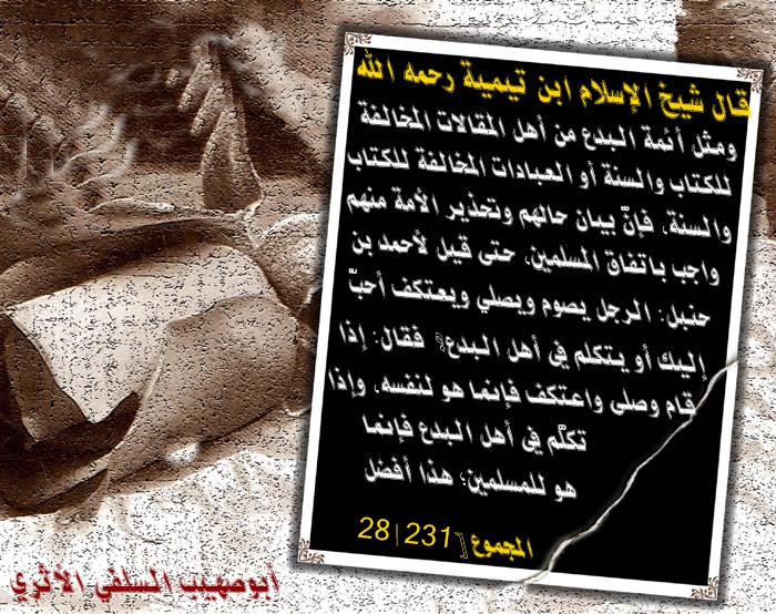 ✵ [ بدائع الفوائد (2/468) ] ✵وقال شيخ الإسلام ابن تيمية رحمه الله [المجموع 28/ 231]: ((ومثل أئمة البدع من أهل المقالات المخالفة للكتاب والسنة أو العبادات المخالفة للكتاب والسنة، فإنَّ بيان حالهم وتحذير الأمة منهم واجب باتفاق المسلمين، حتى قيل لأحمد بن حنبل: الرجل يصوم ويصلي ويعتكف أحبُّ إليك أو يتكلم في أهل البدع؟! فقال: إذا قام وصلى واعتكف فإنما هو لنفسه، وإذا تكلَّم في أهل البدع فإنما هو للمسلمين؛ هذا أفضل)).ملف مرفق 1869ملف مرفق 1870ملف مرفق 1871ملف مرفق 1872