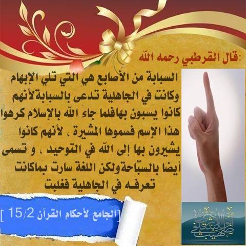 السبابة من اﻷصابع هي التي تلي اﻹبهام ، وكانت في الجاهلية تدعى بالسبابة ،