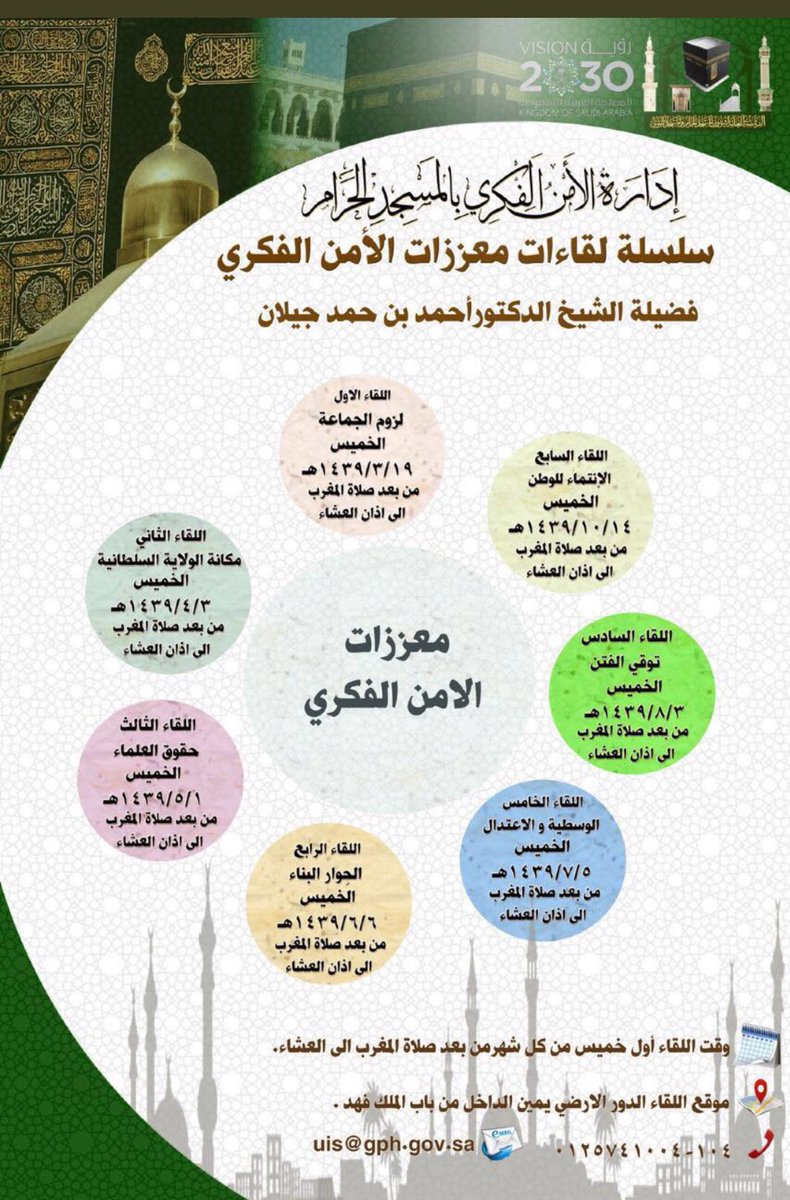 #الأمن_الفكري بـ المسجد_الحرام يقيم سلسلة لقاءات توجيهية بعنوان (معززات الأمن الفكري) للشيخ د. أحمد بن حمد جيلان وذلك في أول خميس من كل شهر ابتداءً من يوم غدٍ في الدور الأرضي يمين الداخل من باب الملك فهد من بعد صلاة المغرب وحتى صلاة العشاء
