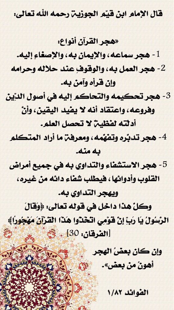 قال الإمام ابن القيم -رحمه الله- : هجر القرآن أنواع