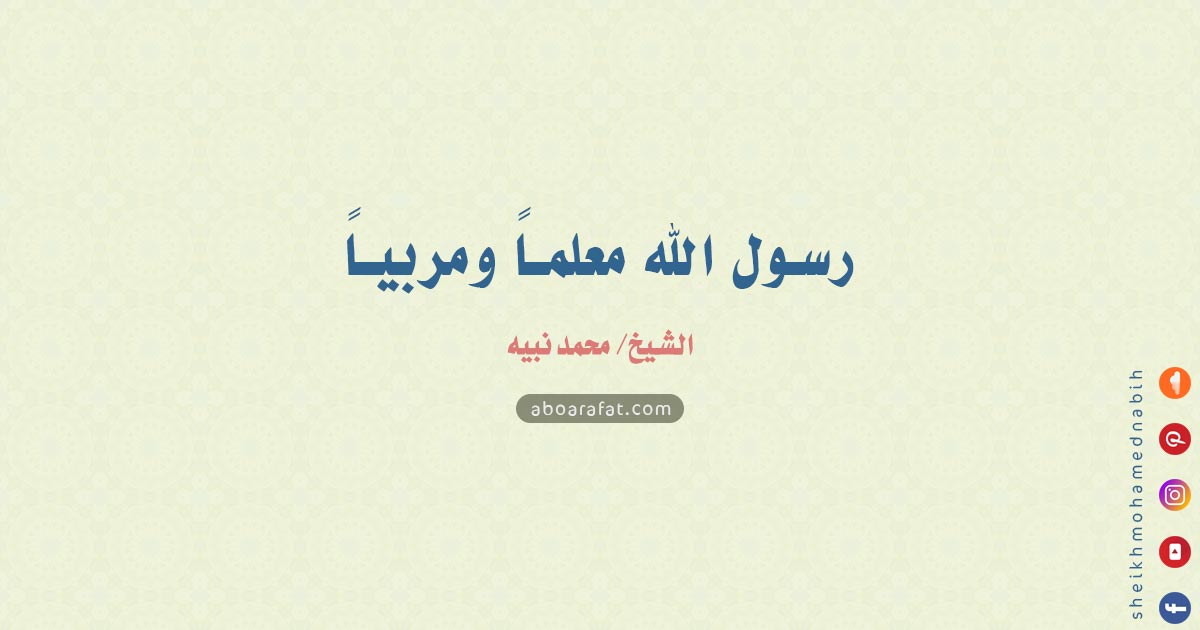 النبي معلماً ومربياً من خطب الجمعة للشيخ محمد نبيه يوضح فيها أساليب النبي صلى الله عليه وسلم في التربية والتعليم من اختيار الوقت المناسب للتربية والرفق بالمتعلم وتعليمه بالأسلوب الحسن وغيرها من الأساليب النبوية.
