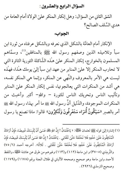 1-كلام الشيخ الألباني يدور حول الإنكار على السلطان علانية في حضرته والدليل حديث أبي سعيد الخدري الذي سئل عنه واستدل به وأجاب بالقاعدة المعروفة " أن من وقع في المنكر علنا ينكر عليه علنا " فحديث أبي سعيد رضي الله عنه في واقع الحال إنكار علني في حضرة السلطان وليس في غيبته ، فلم يذهب أبو سعيد إلى الناس في أسواقهم ومجالسهم ، ولم يصعد المنبر أو يخرج في إعلام مرئي ومسموع ومقروء وينكر على السلطان في غيبته ، ويثلب عليه ويحرض العامة عليه ويذكره بالمنكرات التي هو واقع فيها .. فأين هذا من ذاك ؟!!