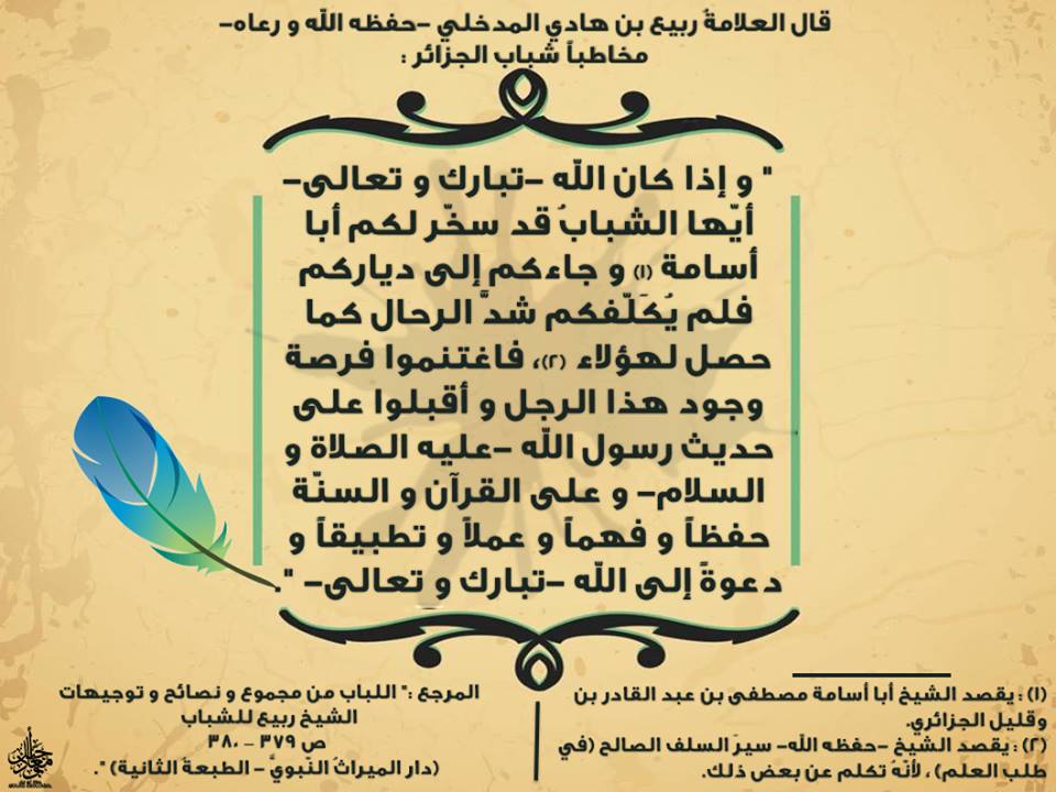 "حثٌ و تشجيعٌ من العلامة ربيع على ملازمة الشيخ أبي أسامة بن وقليل -حفطهما الله و جميع مشايخ السنة- ".قال العلامةُ ربيع بن هادي المدخلي -حفظه الله و رعاه و جعله غصة في حلوق المبتدعة- مخاطباً شباب الجزائر :