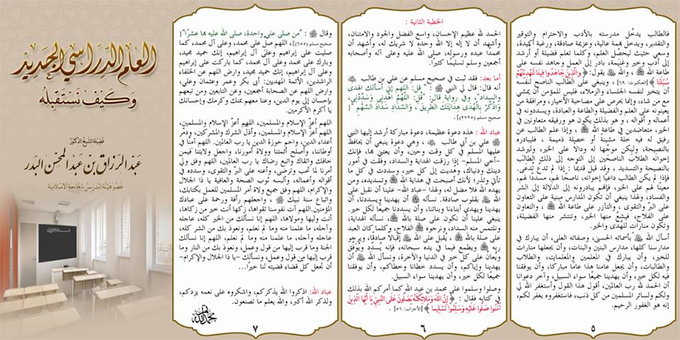 1/ استقبال العام الدراسي الجديد 2/ مسؤولية المعلم والطالب أمام الله تعالى 3/ إخلاص التعلم لله عز وجل 4/ الهمة العالية في طلب العلم 5/ مسؤولية المعلمين في الاعتناء بالنشء 6/ المعلم قدوة لتلاميذه 7/ ضرورة احترام التلاميذ لمعلمهم