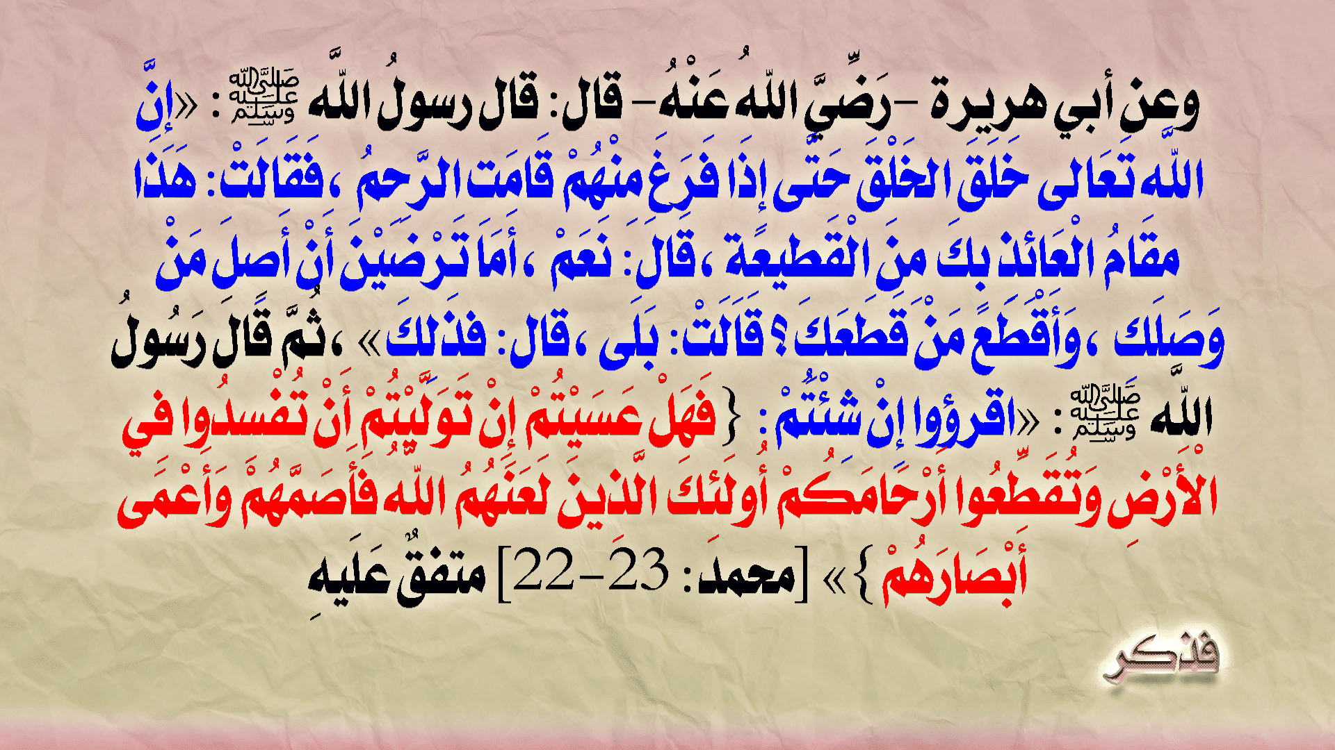 ٣٢٠ - وعن أبي هريرة -رَضِّيَّ اللهُ عَنْهُ- قال: قال رسولُ اللَّه ﷺ: «إِنَّ اللَّه تَعَالى خَلَقَ الخَلْقَ حَتَّى إِذَا فَرَغَ مِنْهُمْ قَامَتِ الرَّحِمُ، فَقَالَتْ: هَذَا مقَامُ الْعَائِذِ بِكَ مِنَ الْقَطِيعَةِ، قَالَ: نَعَمْ، أَمَا تَرْضَيْنَ أَنْ أَصِلَ مَنْ وَصَلَكِ، وَأَقْطَعَ مَنْ قَطَعَكِ؟ قَالَتْ: بَلَى، قال: فذَلِكَ»، ثُمَّ قَالَ رَسُولُ اللَّه ﷺ: «اقرؤوا إِنْ شِئْتُمْ: {فَهَلْ عَسَيْتُمْ إِنْ تَوَلَّيْتُمْ أَنْ تُفْسِدُوا فِي الْأَرْضِ وَتُقَطِّعُوا أَرْحَامَكُمْ أُولَئِكَ الَّذِينَ لَعَنَهُمُ اللَّهُ فَأَصَمَّهُمْ وَأَعْمَى أَبْصَارَهُمْ}» [محمد: ٢٢-٢٣] متفقٌ عَلَيهِ.